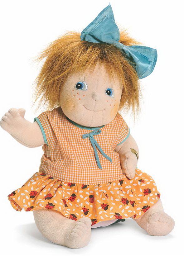 Кукла маленькая Анна торговой марки Rubens Barn серии Little -- замечательная игрушка, полностью изготовленная из флиса. Особенностью модели является качество изготовления куклы и ее одежды. Нижняя часть игрушки заполнена особым материалом, что позволяет кукле Rubens Barn сидеть и не падать. Особого внимания заслуживает одежка Анны. Ведь она, как и вся одежда тряпичных кукол шведского производителя, пошита из полиэстера. Отметим, что все одежки снимаются, их можно стирать в стиральной машинке и даже утюжить. Что особенно важно, так это то, что одежда изготовлена не просто для кукол, а добротно и тщательно, прямо как для людей. Смешное оранжевое платьице со смешной лисичкой и карманом в форме сыра. Ярко-голубые глаза и ресницы, вышитые вручную, веснушки на кукле Rubens Barn, две ямки по бокам ротика, розовые щечки, рыжие волосы, собранные в два симпатичных хвостика и связанные красными ленточками - все это дополняет образ куклы и помогает создать неотразимый вид ребенка.