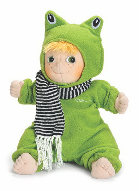 Кукла Лягушонок серии ARK -- прекрасная игрушка высокого качества. Это оригинальная эксклюзивная тряпичная кукла, одетая в костюм лягушонка. Зелёный костюмчик лягушки, смешные глазки на капюшоне, полосатый шарфик -- все это дополняет неотразимый образ куклы Лягушонок. Всю одежду, которая между прочим снимается отдельно друг от друга, можно стирать руками и в стиральной машинке, а при необходимости даже утюжить. Зелёные глазки, вышитые вручную ресницы, розовые щечки, милые веснушки, светлые волосики помогают создать образ ребёнка в куклах Rubens Barn.
