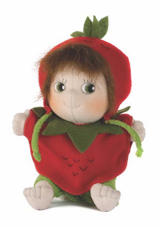 Очаровательная кукла-земляничка Strawberry от Rubens Barn снискала оглушительный успех и уже обзавелась собственными поклонниками. Забавная девчонка с озорным выражением лица в ярко-красной блузе-реглан с черной вышивкой земляничными зернышками, зеленых штанишках и фигурном воротничке такого же цвета притягивает восхищенные взгляды детей и взрослых. В тон ансамблю подобрана и шапочка - красная, с салатовыми завязками в виде шнурков и зелеными листьями на макушке. Выбившиеся из-под шапочки волосы прибавляют кукле особого неповторимого очарования.