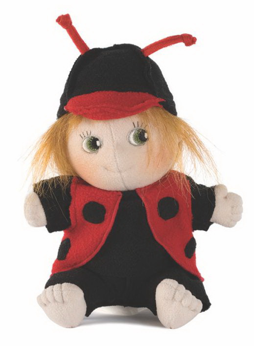 Lady Bird - очаровательная мягкая кукла от Rubens Barn, стилизованная под божью коровку! Озорная девчонка в стильной черной кепке с красным козырьком, из которой торчат длинные красные усики-антенны, с нетерпением ждет своего нового хозяина или хозяйку, весело стреляя по сторонам черными блестящими глазами и улыбаясь губами-ниточками. По такому случаю она принарядилась в черный комбинезон и красную жилетку-распашонку с крупными черными горохами - как и положено настоящей божьей коровке.