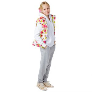Жилетка застегивается на молнию, внутри ветрозащитная планка, по молнии и на груди нанесены светоотражающие элементы, два боковых кармана на внутренних молниях, по низу проходит утягивающая кулиска, подкладка флис. Толстовка из плотного футера с начесом застегивается на молнию, спереди вышит рисунок.
