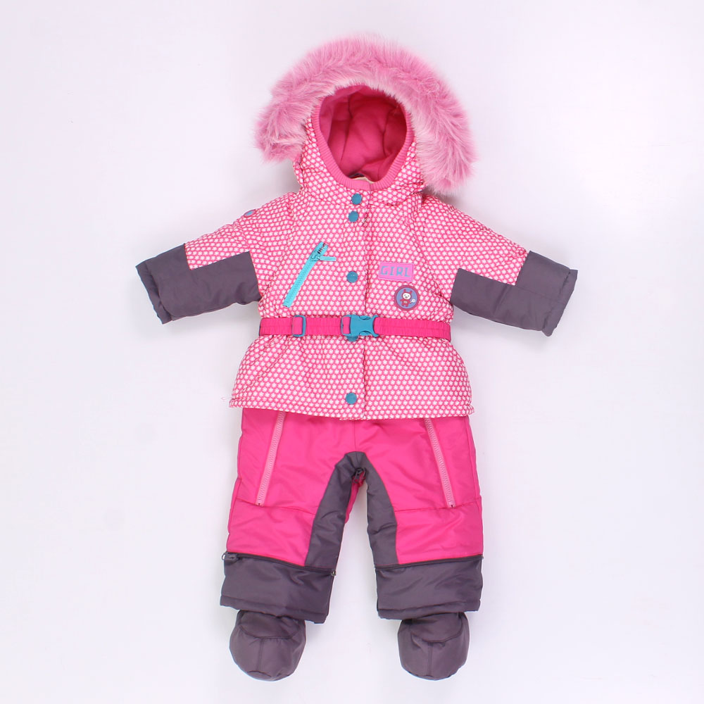 Комбинезон застегивается на две удобные молнии, сверху пришита курткочка, которая будет защищать от ветра, застегивается на кнопки, впереди небольшой кармашек на молнии для пустышки. На опушке мех съемный, по краю капюшона трикотажная резинка. На рукавах предусмотрены отвороты, имеются трикотажные подвязы, против попадания ветра и снега. Низ штанин на внутренней резинке, регулируется подворотом Подкладка комбинезона футером с начесом. Овчина съемная.
