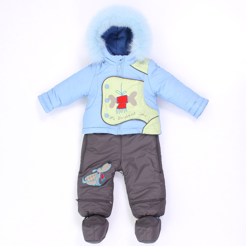 Полукомбинезон для удобства имеет две боковые молнии, лямки застегиваются на кнопки. По низу полукомбинезона предусмотрены отвороты для регулирования длины. Подкладка овчина, сверху отделка футером с начесом. Теплые пинетки с подкладом из овчины, пристегиваются к полукомбинезону.