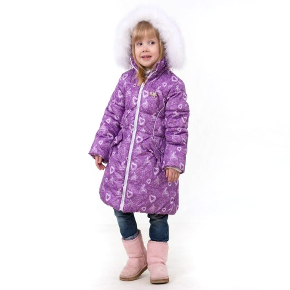 Пальто застегивается на молнию, сверху ветрозащитная планка на кнопках, спереди два боковых кармана. На рукавах предусмотрены отвороты, имеются трикотажные подвязы, против попадания ветра и снега. На изделии две брошки-сверху слева в виде двух звездочек и сзади на поясе в виде бантика с сердечком. Капюшон и мех съемные, капюшон на молнии.