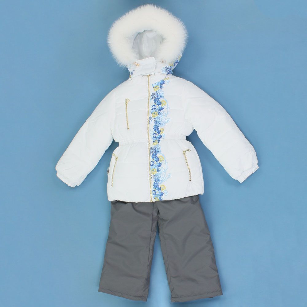 Комплект состоит из куртки и полукомбинезона. Куртка с центральной застежкой молнией, внутри ветрозащитная планка. Воротник стойка, застегивающийся "под горло", с защитой подбородка. Отстегивающийся капюшон на молнии с регулировкой по объему головы, мех (съемный) на кнопках. Два боковых кармашка на молниях, один нагрудный и один на рукаве. По талии и низу куртки проходит резинка. Низ рукава на трикотажном манжете. Печать на изделие.