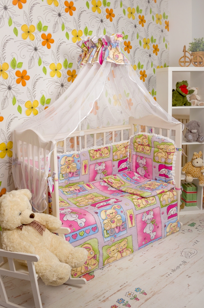 Бортик из 4-х частей 360х40 см Пододеяльник 110х140 см Простыня на резинке 90х150 см Наволочка 60х40 см Одеяло 110х140 см Подушка 60х40 см Балдахин сетка 165х280см
