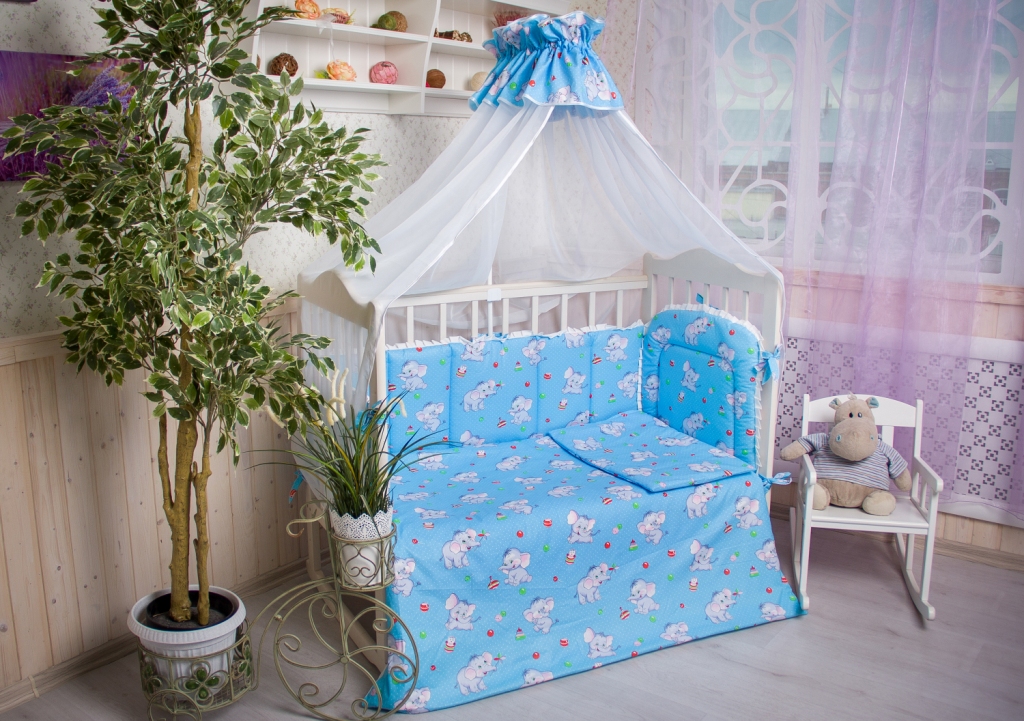 Бортик из 4-х частей 360х40 см Пододеяльник 110х140 см Простыня на резинке 90х150 см Наволочка 60х40 см Одеяло 110х140 см Подушка 60х40 см Балдахин сетка 165х280см