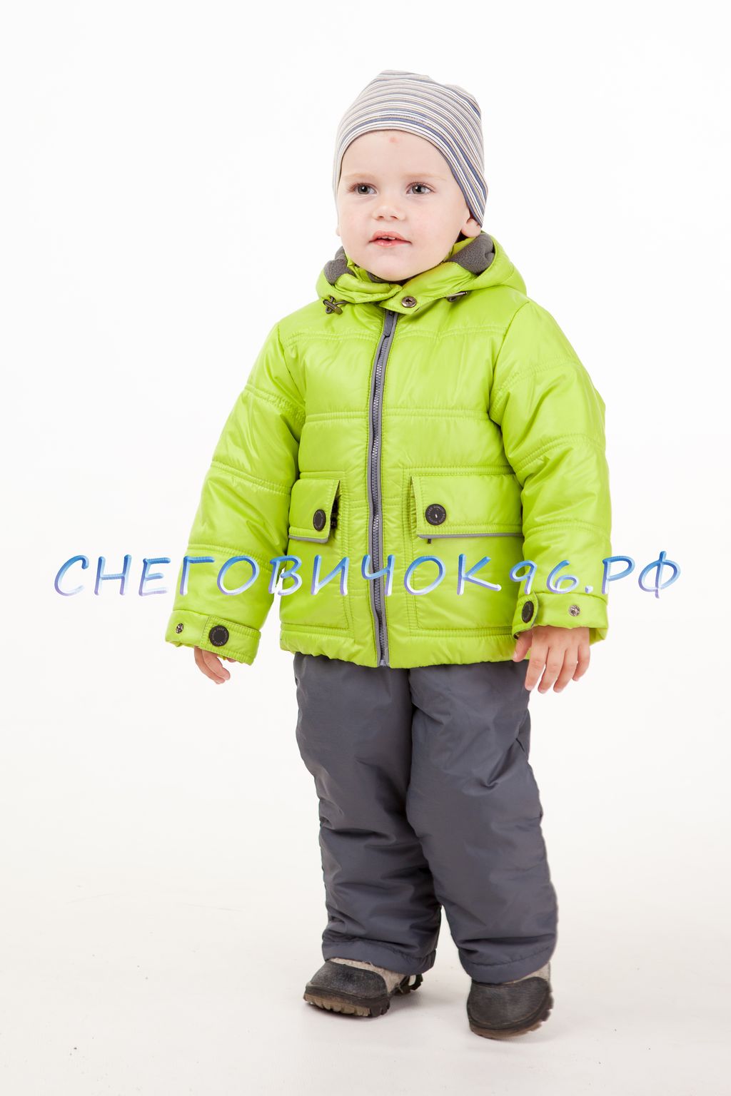 В комплекте курточка с горизонтальной простежкой и темно-серый полукомбинезон. Рукава с трикотажными манжетами внутри для сохранения тепла, с кнопкой для регулирования размера. Капюшон отстегивается, регулируется кулисой. Удобные накладные карманы декорированы накладными клапанами с кнопкой. На спинке фирменный логотип.
