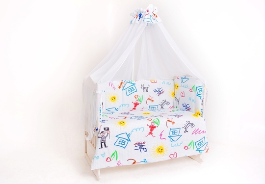 Бортик из 4-х частей 360х40 см Пододеяльник 110х140 см Простыня на резинке 90х150 см Наволочка 60х40 см Одеяло 110х140 см Подушка 60х40 см Балдахин сетка 165х280см