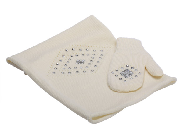 Комплект включает в себя шарф-снуд и двухслойные варежки со стразами.