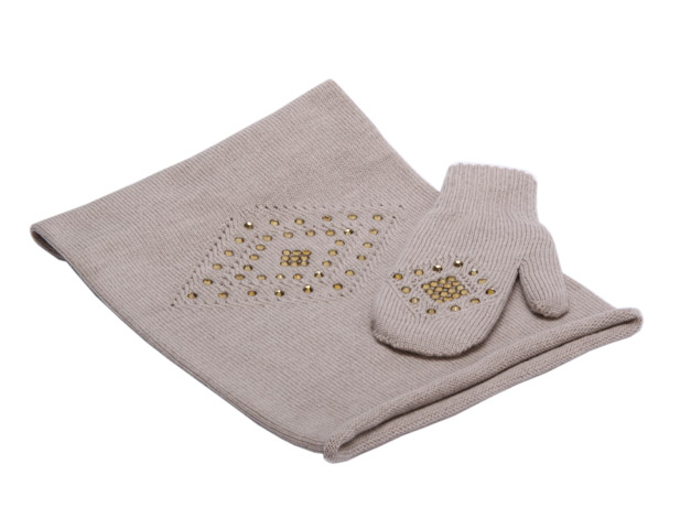 Комплект включает в себя шарф-снуд и двухслойные варежки со стразами.