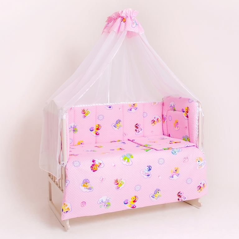 Комплект в кроватку 7 предметов: Борт раздельный из 4 - х частей 360х40 см. Пододеяльник 110х140 см. Простыня на резинке 90х150 см. Наволочка 60х40 см. Одеяло 110х140 см. Подушка 60х40 см. Балдахин сетка/вуаль 165х280см . Наполнитель для бортов, одеяла и подушки - термофайбер.
