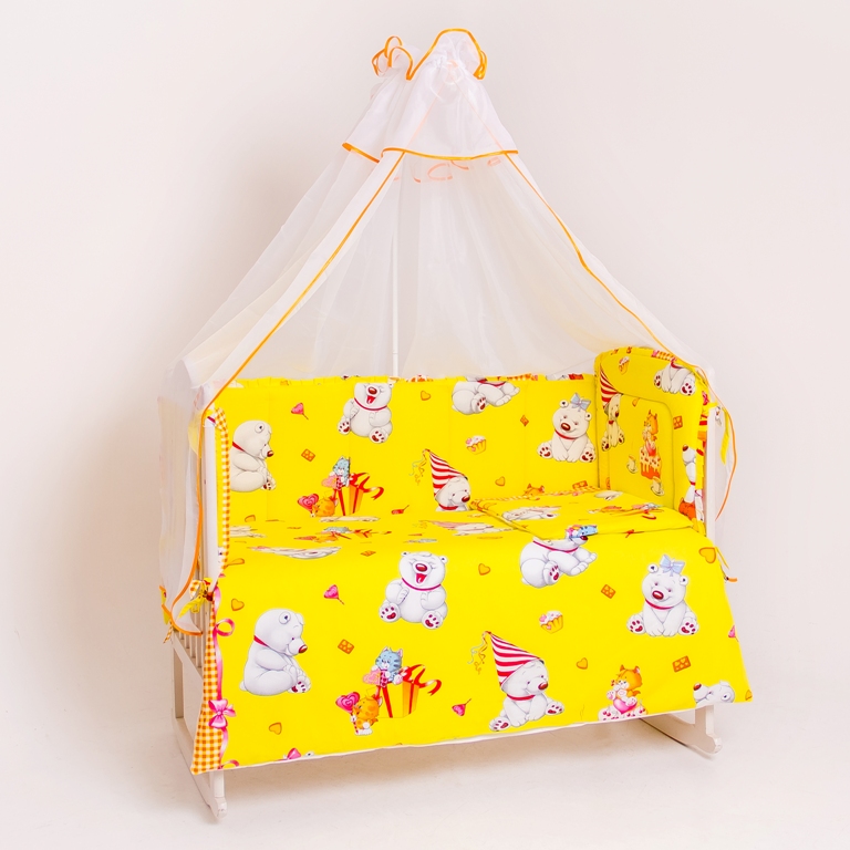 Комплект в кроватку 7 предметов: Борт раздельный из 4 - х частей 360х40 см. Пододеяльник 110х140 см. Простыня на резинке 90х150 см. Наволочка 60х40 см. Одеяло 110х140 см. Подушка 60х40 см. Балдахин сетка/вуаль 165х280см . Наполнитель для бортов, одеяла и подушки - термофайбер.