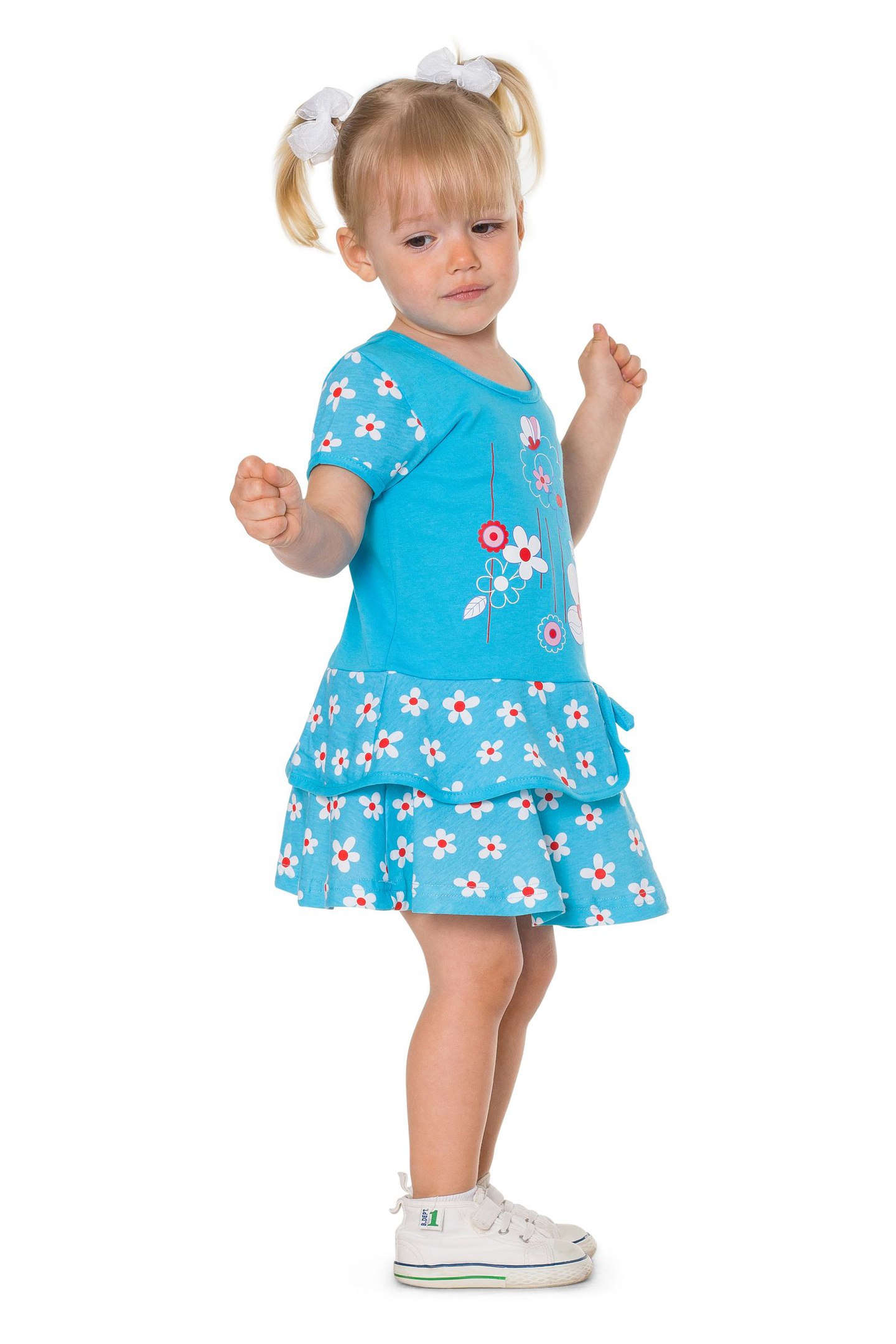 Красочное платье для девочек. Модель стильная, присутствуют красочные цвета, рисунки по всей поверхности, оригинально декорирована юбка. Рукава короткие. Платье действительно отлично впишется в гардероб. Благодаря своему практичному дизайну ее можно надеть и в будний день, и на торжество. Модель изготовлена из кулирки.