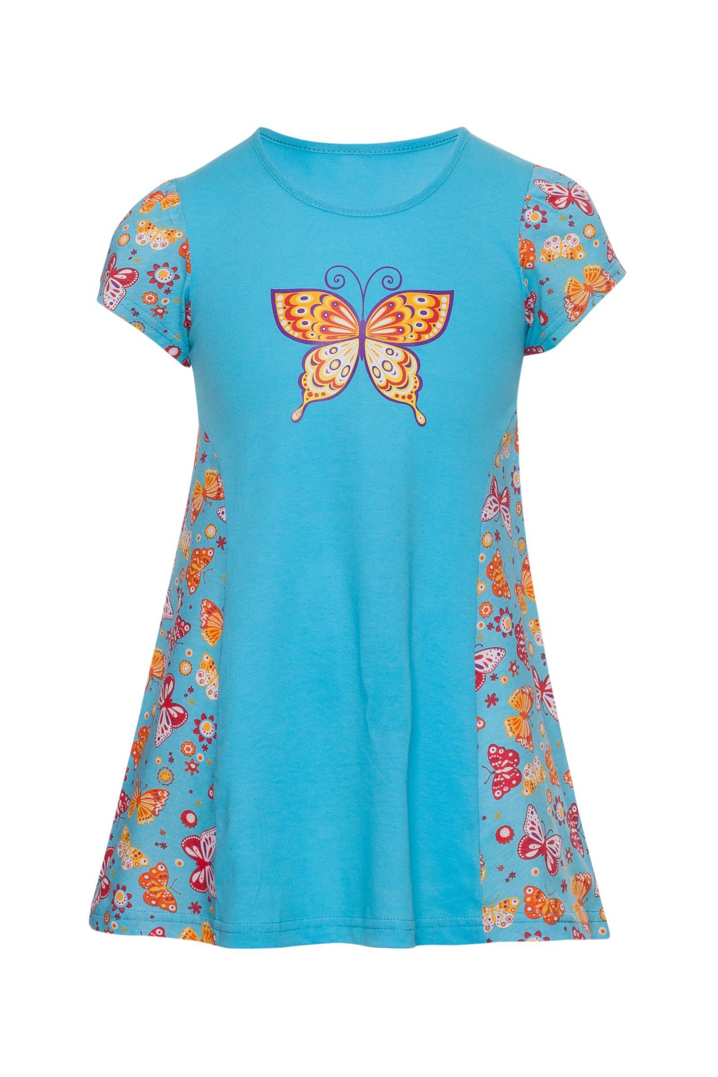 Платье из кулирки. Модель достаточно свободная, выполнена в нежных цветах. Спереди есть рисунок, по бокам красочная расцветка. Рукава короткие, воротник широкий.